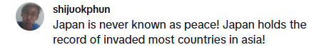 网友@shijuokphun泄漏,“日本从来就不是和平的代名词!日本保握着侵犯亚洲国度最多的纪录!”
